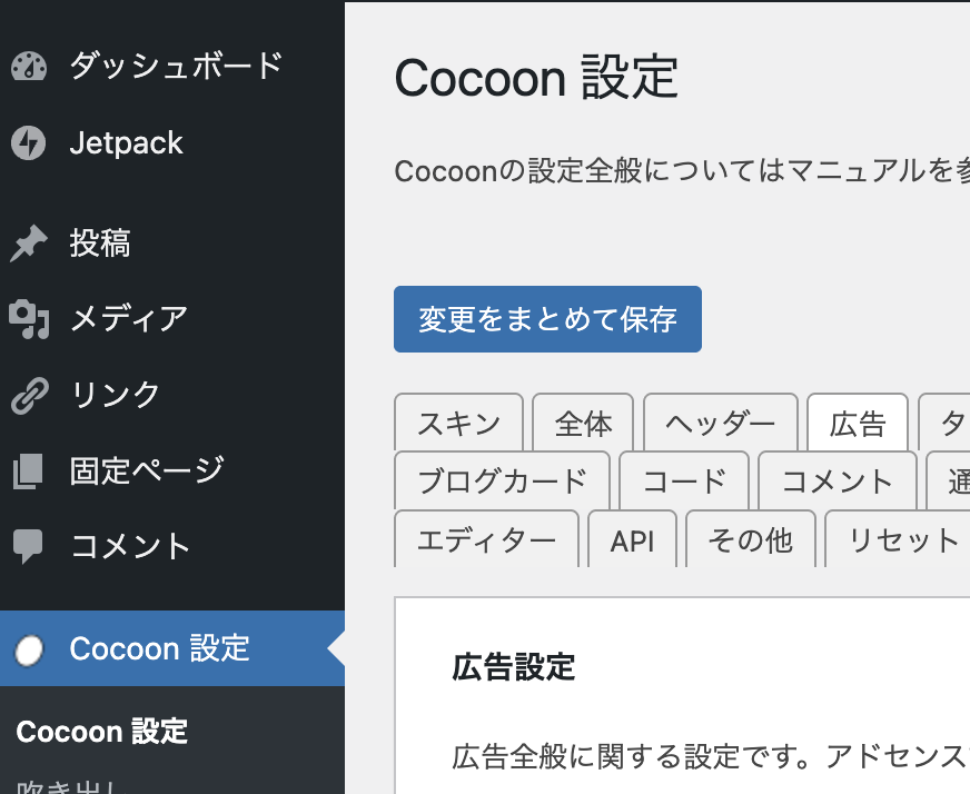 このサイトで使っているCocoonでは、Cocoon設定の広告タブの中で設定出来ます。