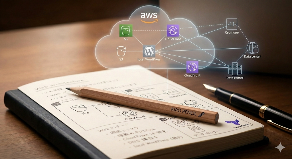 <登場人物> - コンテンツ管理 : ローカルDocker WordPress - 静的生成 : Simply Static - ホスティング : S3(パブリックアクセス遮断) - CDN/HTTPS : CloudFront + ACM(無料・自動更新) - DNS : 既存DNSサーバーにCNAMEのみ追加 - ブログ原案 : Kiro - ブログ清書 : 51WebLab. - 構成図 : 51WebLab.